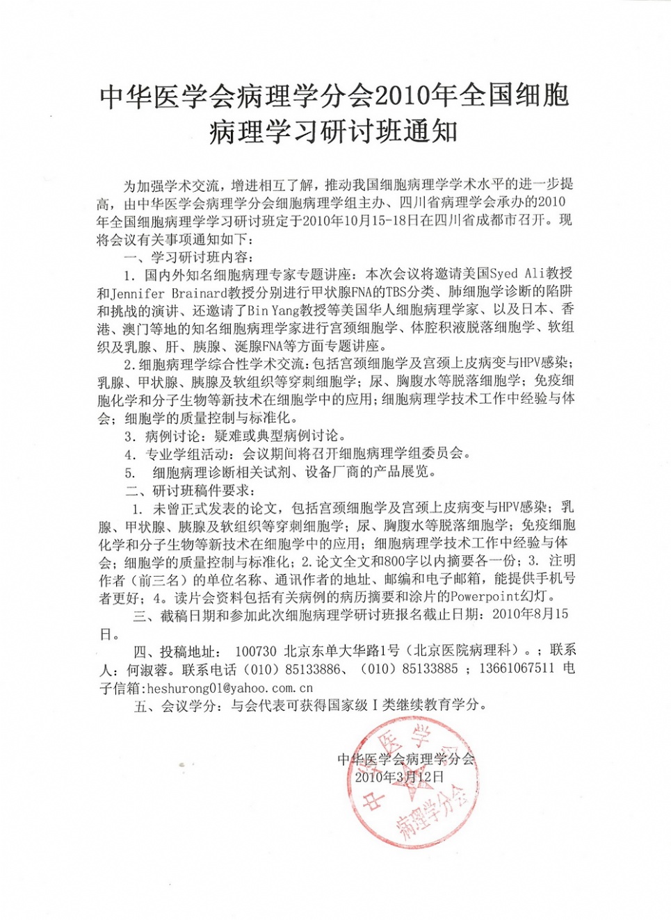 中华医学会病理学分会2010年全国细胞病理学习研讨班通知