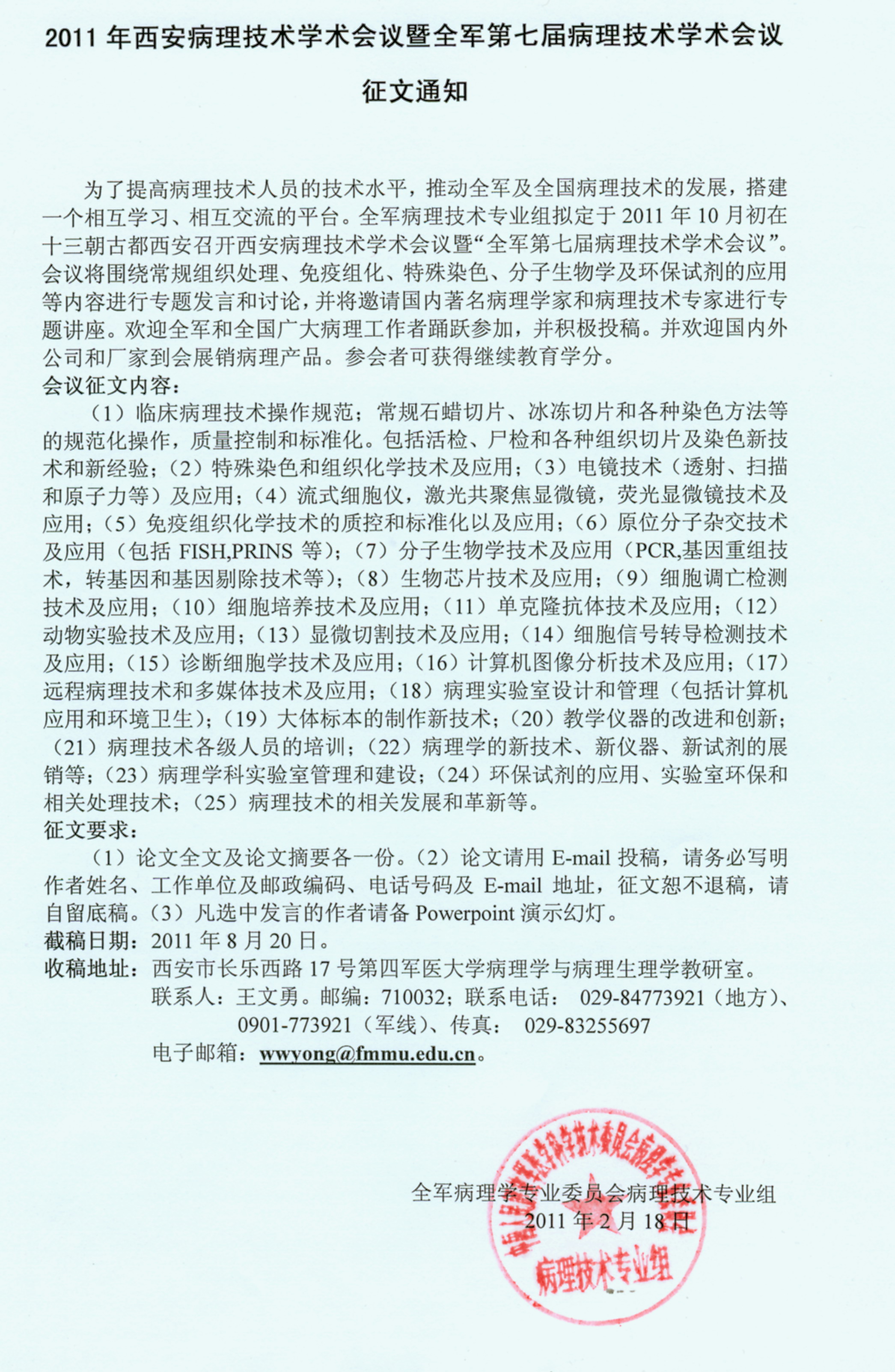 2011年西安病理技术学术会议暨全军第七届病理技术学术会议征文通知
