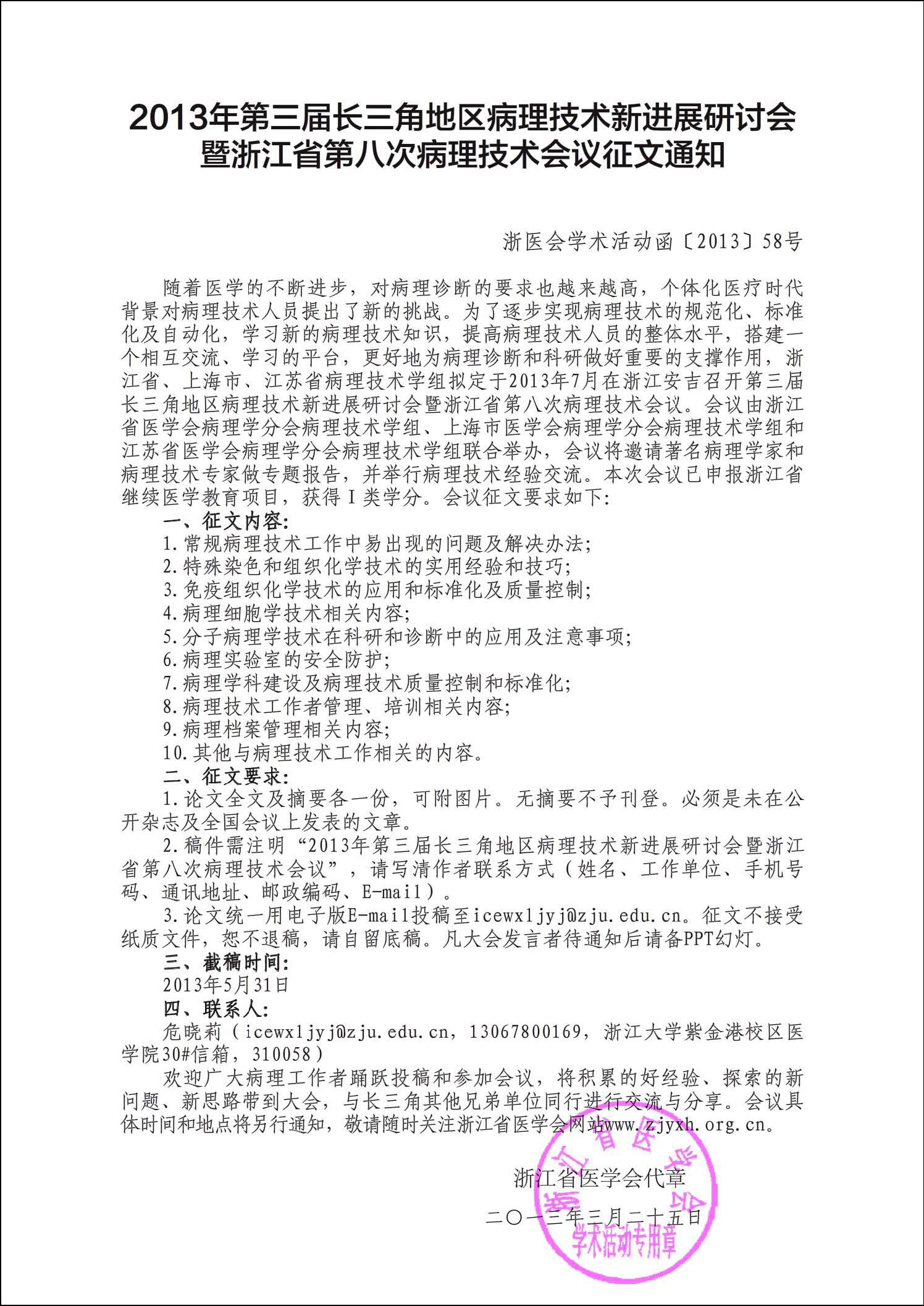 2013年第三届长三角地区病理技术会议征文通知