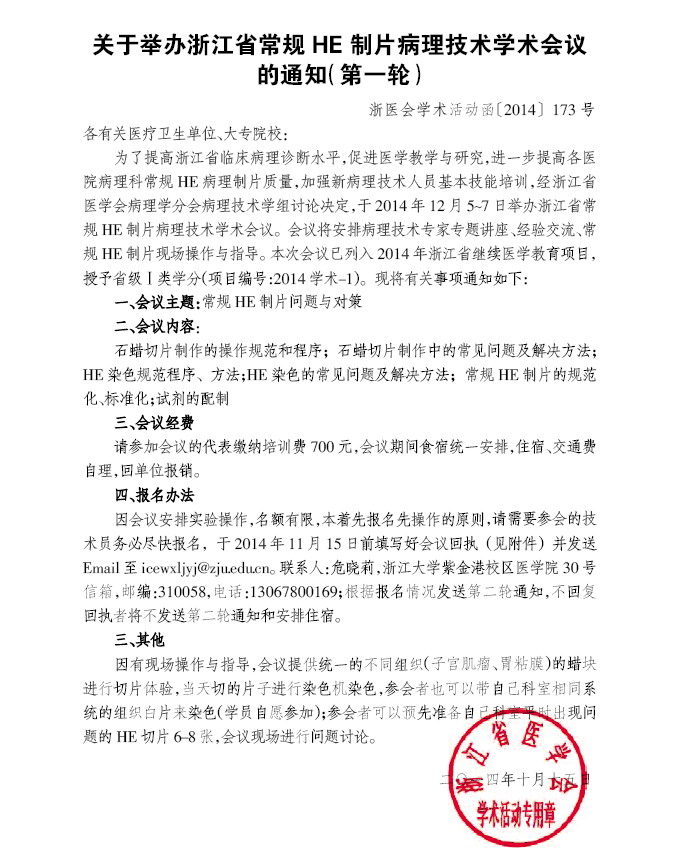 关于举办浙江省常规HE 制片病理技术学术会议通知